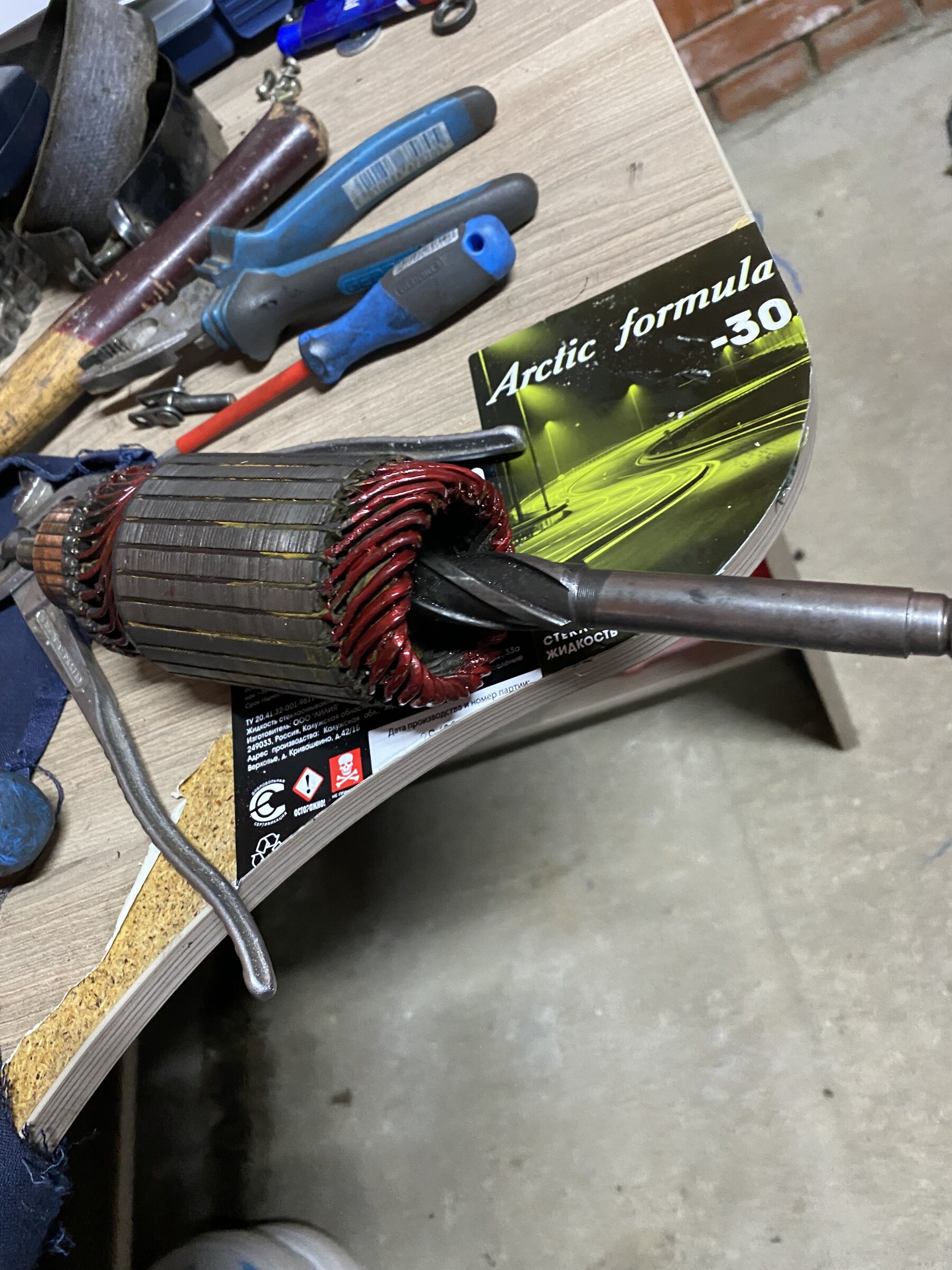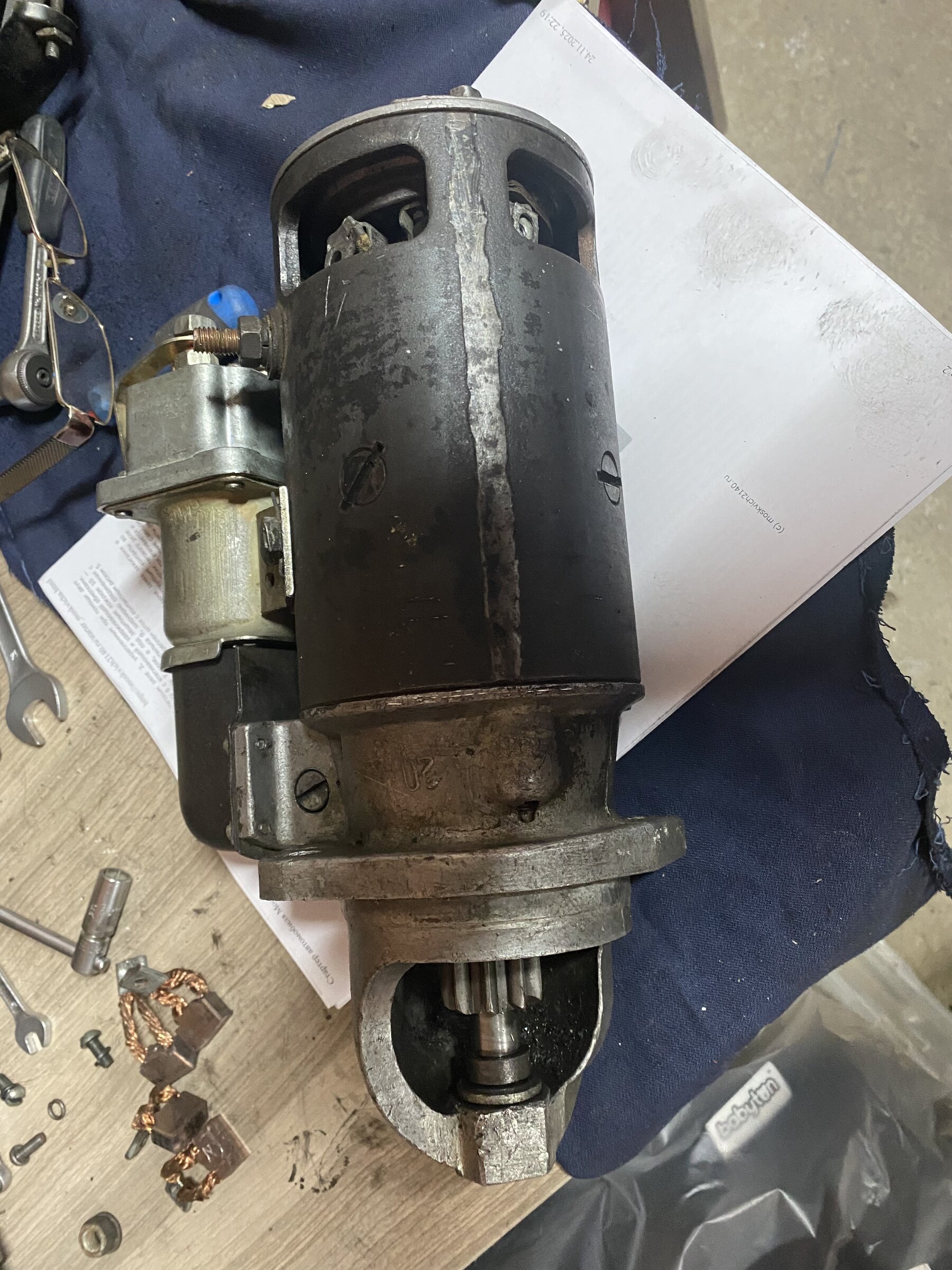 На неделе приобрел уставшего донора для стартера, после разборки выяснилось что живого в нем только статор, шайбочки и крышка щеткодержателя, а больше мне и не надо. Якорь свой оставил, т.к. шейки по втулкам корпусов и ламели четкие, только потертую обмотку запечатал эмалью. Собрал по книжке и настроил в допусках как пишут. Проверил от аккумулятора, моторчик вращается тихо, без посторонних шумов.