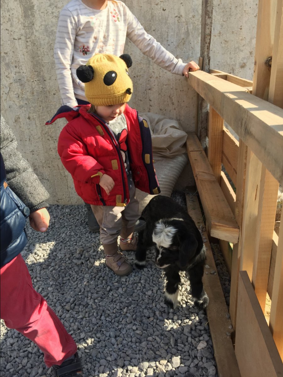 Самая малая познает мир,пыталась новорождённого козлёнка забрать домой в свои игрушки)))