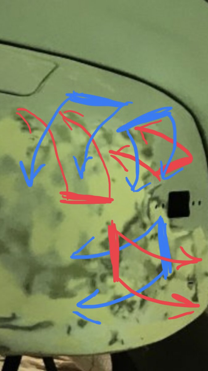На направление стрелок не обращай внимание, главное движение перекрестное, пару, тройку раз в одном направлении, пару тройку раз в перекрестном. Главное чтоб брусок всегда был паралелен изгибу-ребру.