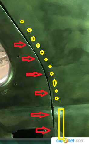 немного усадить-снять привалочную поверхность на арке, и усадить внутрь привалочную поверхность крыла,простучав молотком с упором из нутри крыла плоским куском железяки мм 5-6 толщиной (кусок рессоры обрезанной ровно в самый раз, с приваренной ручкой) упор из нутри по желтой линии,с этим думаю понятно и все просто.