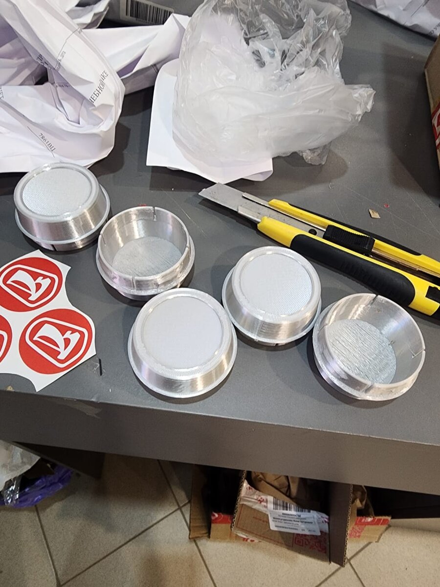 Колпачки приехали Яндексом. Цена 2 000 ру, доставка 189 руб. При этом в объявлении на Авито - продавец Евгений заявлял про то, что в комплект входит - 4 колпачка и 8 наклеечек. По факту положил в заказ + 1 колпачёк и + 1 наклеечку сверх заявленнных в объявлении. Дай бог ему здоровья и долгих лет жизни. Сделаны колпачки я так понимаю на 3Д принтере, пластик такой глянцевый снаружи, что да-же красить его не надо. Жду не дождусь "свадьбы колпачка и дисков".И, хехе, поиск колпачков на Мельберы)