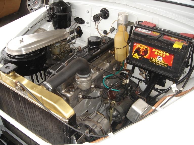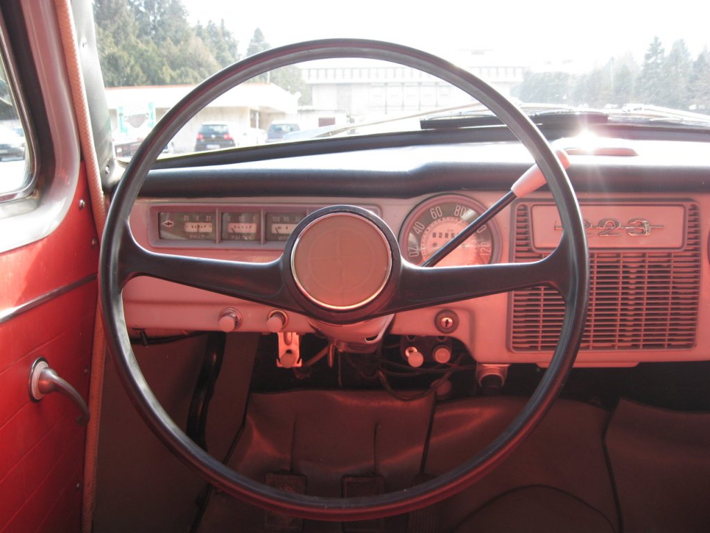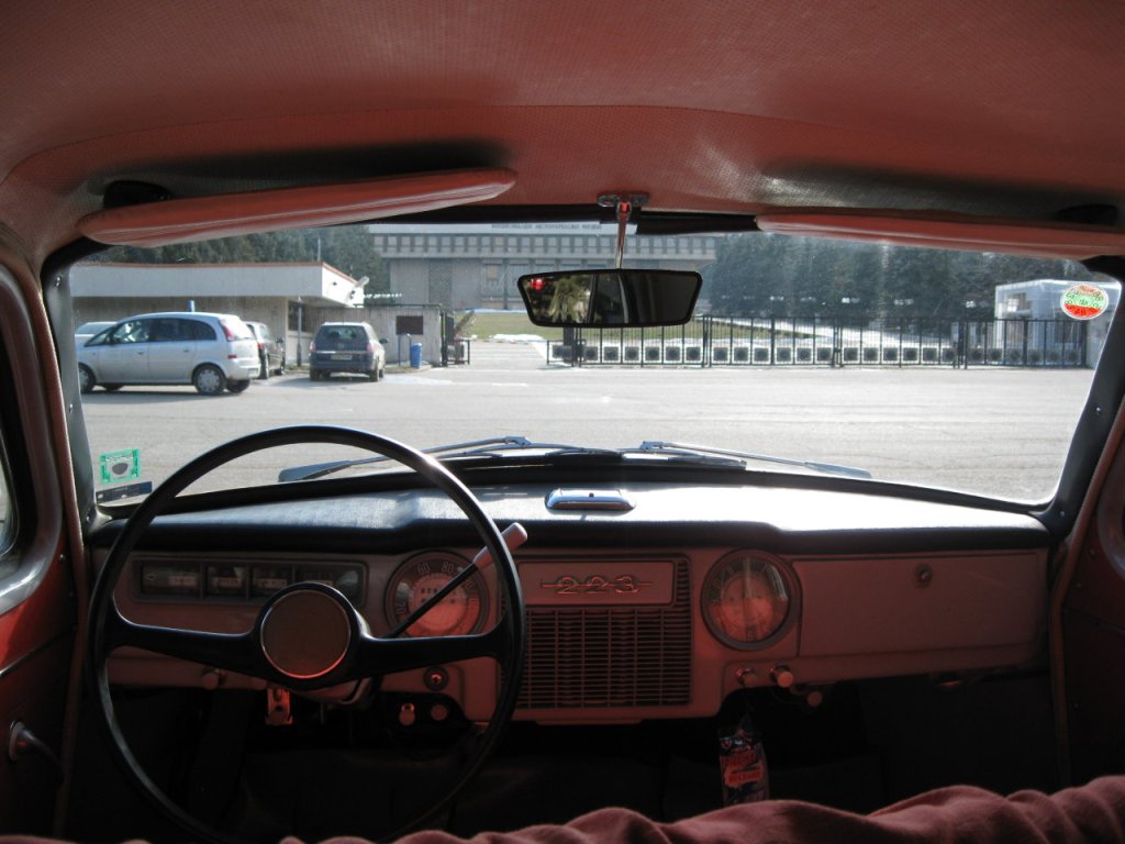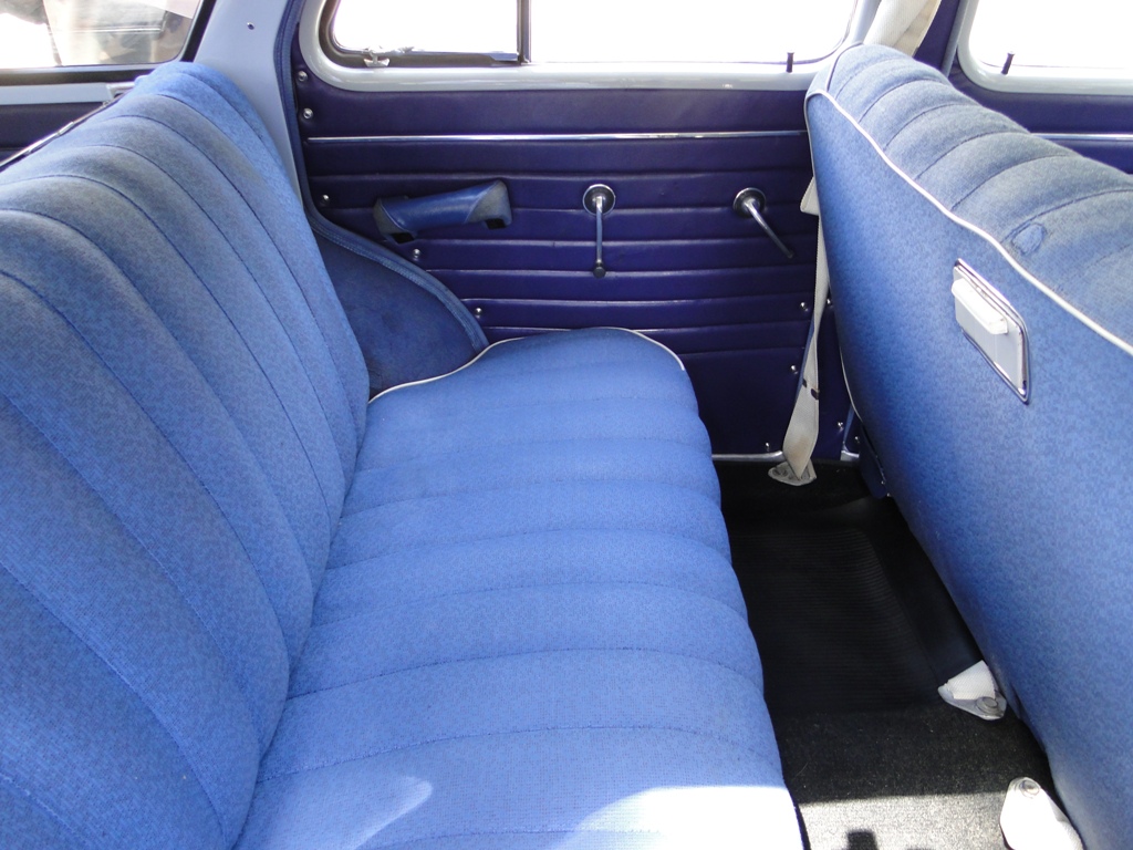 Другой корпус рулевой колонки,новое торпедо со черной пластиковой верхней части.Потолок сшит из козжама,травмобезопасные солнцезащитные козырки-козжам,перфорация и гладкий.Дверные карты,полностью козжам,диваны полностью тканевые.Другая облицовка приборов -материал цам,облицовку с бардачка убрали.Вернули подлокотники передним дверям,а убрали поручня в спинке дивана.Седан оснащен стеклоомывателем с ручным приводом. Держатель из проволоки и пластиковую бочку прикреплены к полке АКБ. Ручной насос в виде кнопки,прикреплен к торпеде снизу,ближе к центру. На центральной панели,на табличке,стоит шильдик с номером модели.Другое салонное зеркало.Внутренные ручки сделаны из алюминия.