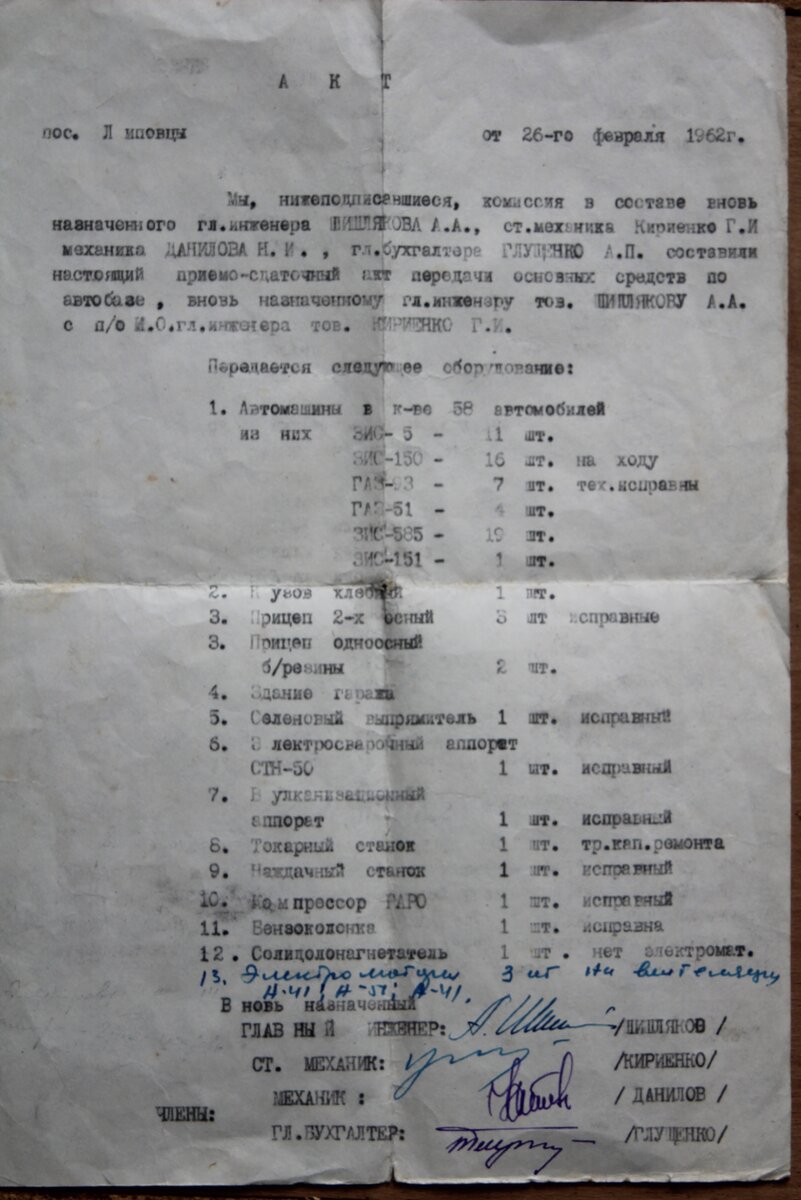 По распределению папа попал механиком в автобазу маленького шахтёрского посёлка Липовцы в Уссурийском крае. Примерно через пол года его назначают главным инженером, сохранился интересный документ.