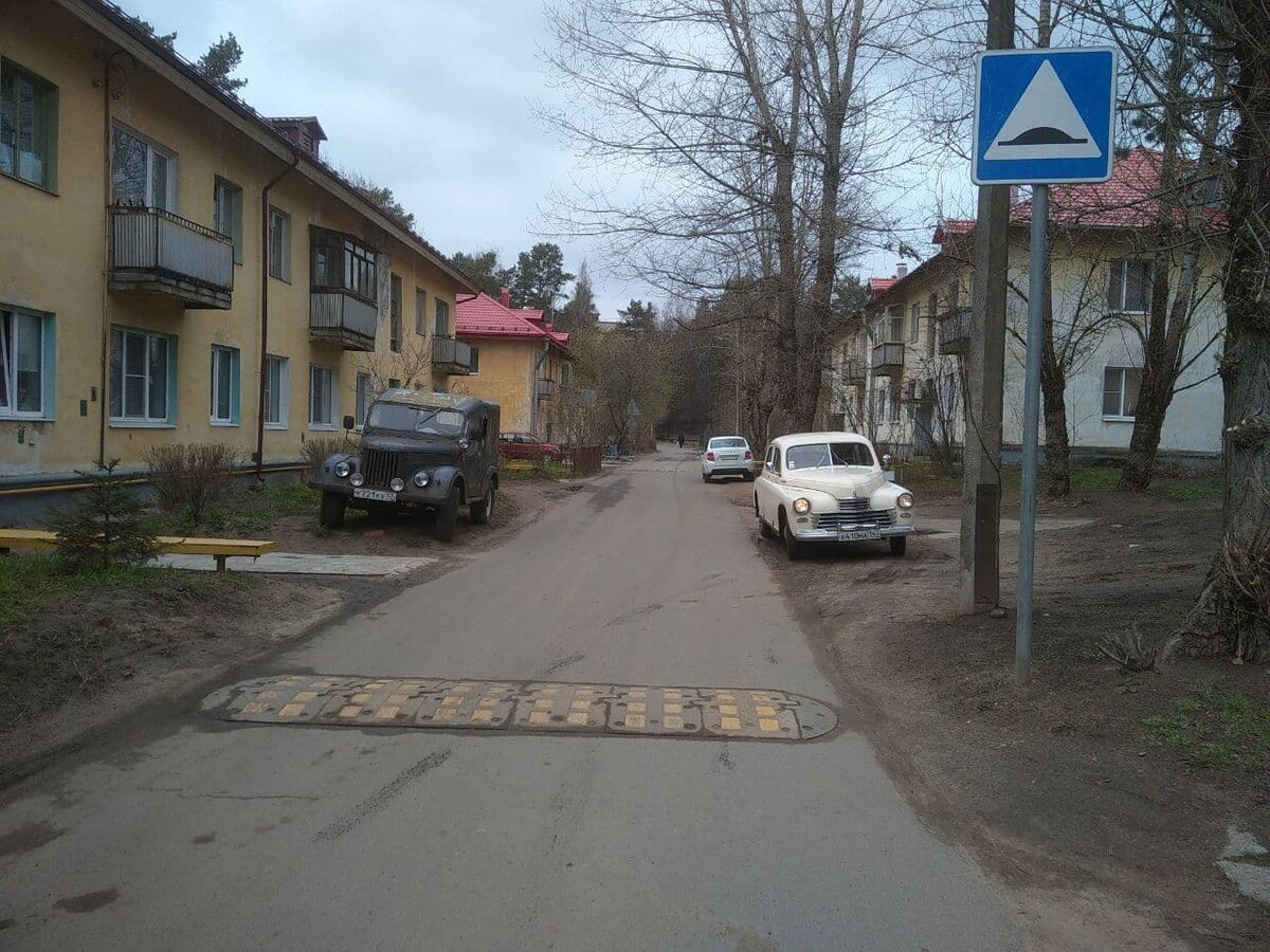 Пять лишних обьектов в кадре, две современные машины, лежачий, пластиковые окна и железные крышы.
