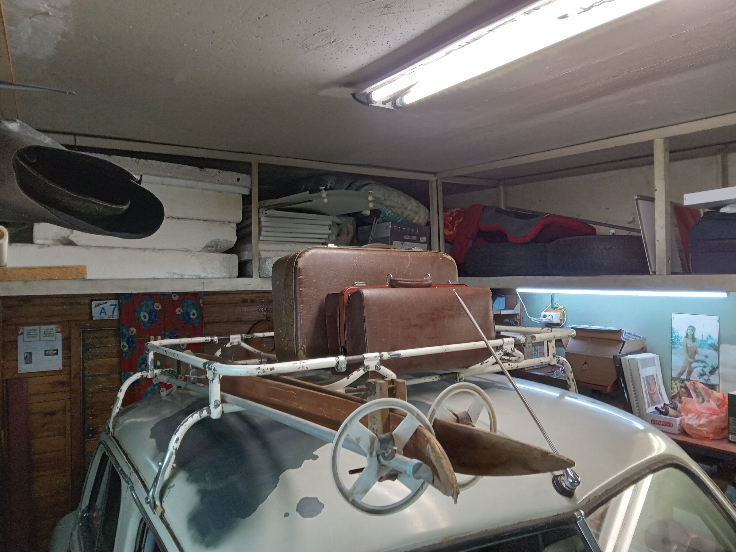 Лыжи кстати то-же древние какие-то, но в хорошем сохране, у них вместо современных "гомосячных" липучек-креплений - использованы деревянные стяжки с вертушками, напоминают струбцины столяра. Да-же деколи на креплениях и лыжах сохранились. Какой год - не знаю🤔. Кстати палки лыжные бамбуковые у меня есть "нульцевые", в другом гараже лежат, надо их к этим лыжам в комплект принести и поставить;)