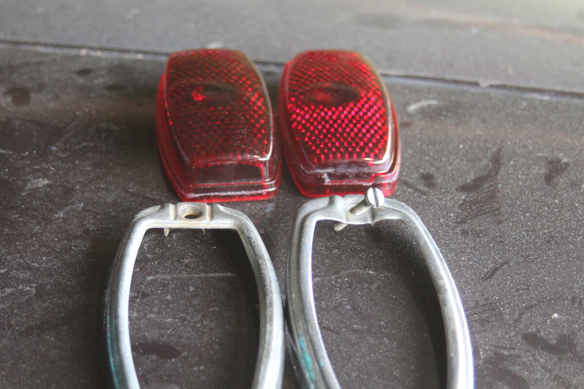 Слева раннее стекло с ободком. На нем "пупырышки" расположены чаще и оно лучше отражает свет, как катафот. ободок под винт с плоской головкой. Ранних ободков сохранилось гораздо больше чем стекол и корпусов, ибо стекла бились, корпуса сгнивали, а латунные ободки нещадно мяли прикручивая к поздним стеклам винтами с головкой в полупотай, но они латунные и не плохо дожили до наших дней.