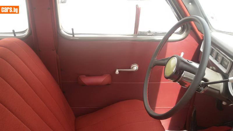 Другой корпус рулевой колонки,новое торпедо со черной пластиковой верхней части.Потолок сшит из козжама,травмобезопасные солнцезащитные козырки-козжам,перфорация и гладкий.Дверные карты,полностью козжам,диваны полностью тканевые.Другая облицовка приборов -материал цам,облицовку с бардачка убрали.Вернули подлокотники передним дверям,а убрали поручня в спинке дивана.Седан оснащен стеклоомывателем с ручным приводом. Держатель из проволоки и пластиковую бочку прикреплены к полке АКБ. Ручной насос в виде кнопки,прикреплен к торпеде снизу,ближе к центру. На центральной панели,на табличке,стоит шильдик с номером модели.Другое салонное зеркало.Внутренные ручки сделаны из алюминия.