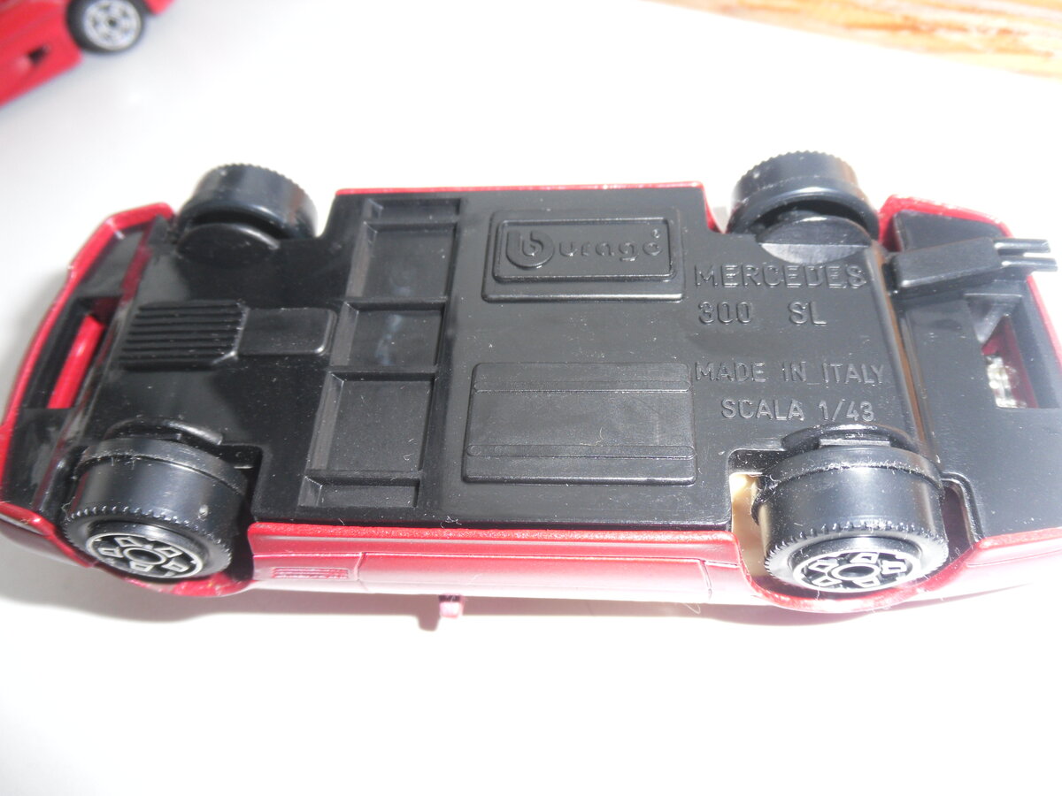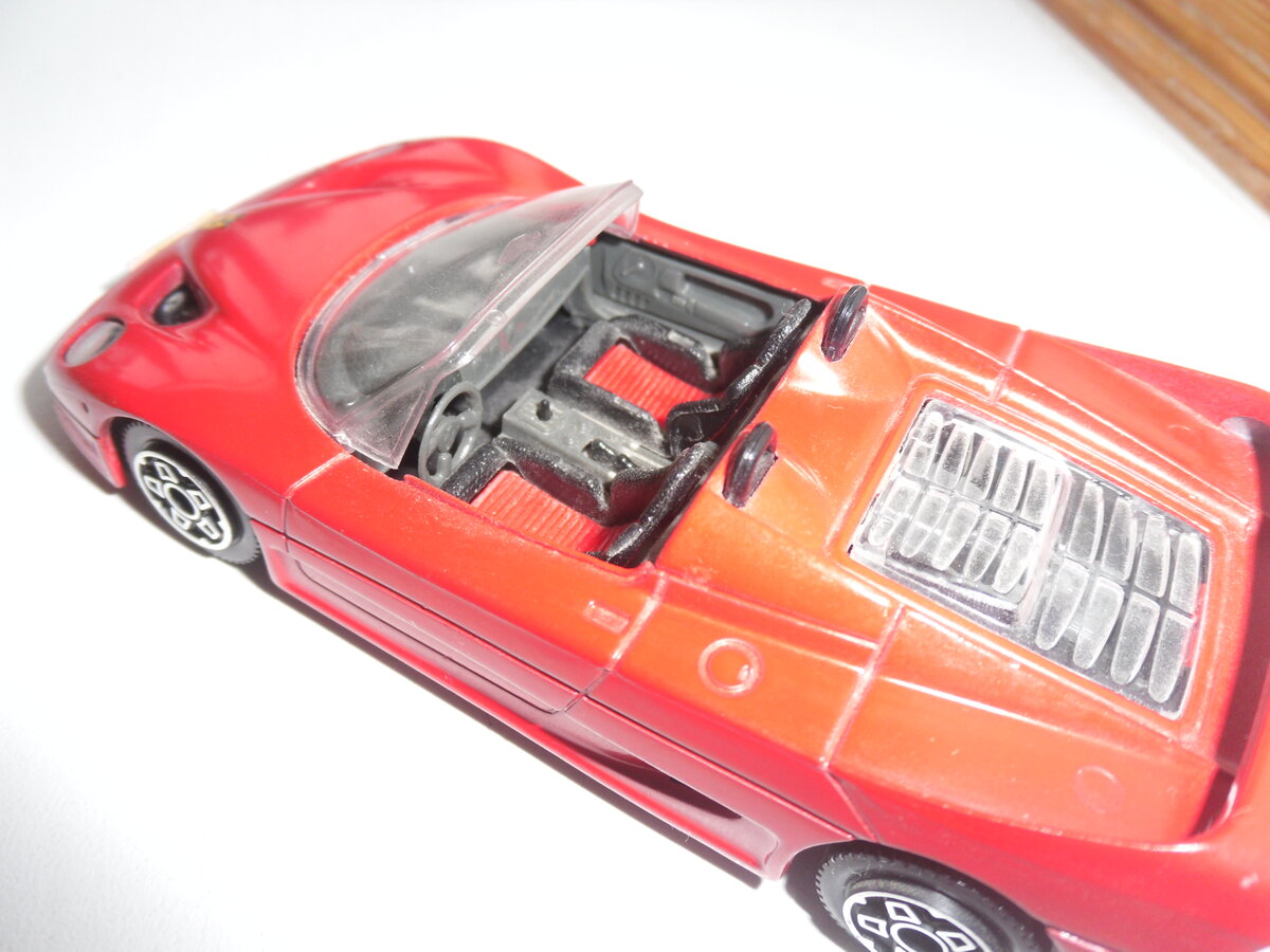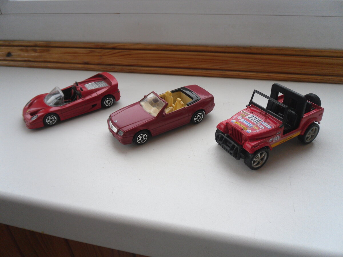 Ещё машинки. Ранние "Бураго", то-же 93-94 гг. покупки. "Мерседес 300 СЛ" и "Феррари Ф 50", "Джип". Кабрио и видимо поэтому качество получше. , диски опять-же все одинаковые. Детализация салона "неплохая" и появился намёк на детализацию днища - Ура, кроме Феррари. У "мерседеса" даже можно переключать хромированной ручкой в салоне передачи. Ну и надписи Сделано в Италии - радуют)))