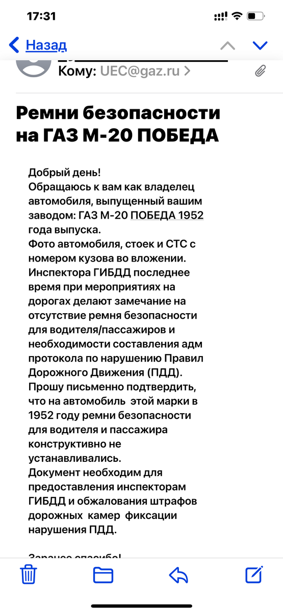 На победы не приходило, на Волгу чаще.Андрей, это письмо касаемо Волг, ГАЗ 21. А люди в погонах немного тупят (впрочем и очень тупят). Есть ли письмо у тебя по нашим Победам, где именно фигурирует марка автомобиля - ГАЗ 20-?